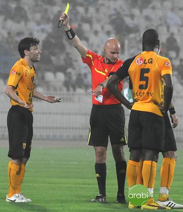 في المقابل، شاب اداء العربي اخطاء دفاعية كثيرة، وبان واضحا وجود ضعف في الجهة اليسرى لديه التي كانت «دفرسوارا» للاعبي القادسية، وبدت احد اسباب السقوط. كان «الاخضر» بلا طعم امس، وتكالبت العوامل السلبية في وجهه وتأثر بدرجة كبيرة بخلخلة دفاعه بعد خروج عبد العزيز فاضل، وطرد احمد سعد الرشيدي، والهدف الخطأ من روك، وهو كان نقطة التراجع. وما فاقم من الصعوبات لدى العربي هو لجوء مدربه الى تغيير اضطراري في الظاهر، بإخراج محمد زينو مع بداية الشوط الثاني، ودخول نواف شويع لضبط خط الوسط، ولكنه كان مقدمة لانحدار في العطاء ونقصا في العدد والفعالية الهجومية لفريق ناقص عددا ومتأخرا في النتيجة! ادار اللقاء طاقم حكام فرنسي بقيادة طوني شابرون، وعاونه مواطناه ايمانويل بوسكين وسيريل غرونغيه، وانذر الحكم جهاد الحسين (القادسية) وعبد الله الشمالي وفهد الحشاش وخواكين فاكا وامير سعيود (العربي). وطرد الحكم بالبطاقة الحمراء احمد سعد الرشيدي مدافع العربي قبل نهاية الشوط الاول بدقائق بسبب شده فانيلة بدر المطوع المنفرد اولا، ثم ابعاده الكرة فيما بعد علما ان الحكم الفرنسي منح المطوع افضلية في البداية.