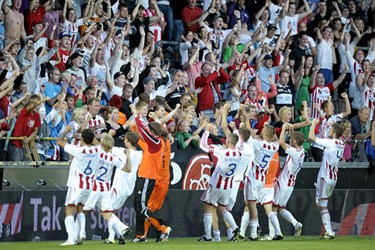 فرحة لاعبي البورغ بعد اللقاء ويظهر بها لاعبنا لؤي شنكو رقم (6)