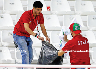 ضربت الجماهير السورية والفلسطينية مثلاً في التحضر والالتزام عقب مباراة منتخب بلادهم، حيث تجمعت الجماهير وتآزرت لجمع المخلفات وتنظيف المدرجات بعد انتهاء المباراة، في مشهد حضاري يستحق الاحترام والتقدير. وبدأ السوريون الأمر في المدرجات وحذت الجماهير الفلسطينية حذوهم، حيث قاموا بتنظيف المدرجات وجمع المخلفات في أكياس، تاركين خلفهم المدرجات نظيفة كما دخلوها.