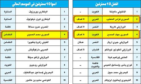 واحتل لاعبنا فراس الخطيب الذي يتالق مع العربي المركز الثاني في قائمة افضل 10 محترفين, بينما احتل لاعبنا جهاد الحسين الذي يقدم عروض رائعة مع الكويت المركز الرابع بنفس القائمة, بينما احتل حيان الحموي الذي لعب للتضامن مدة قصيرة المركز الرابع في قائمة اسوء 10 محترفين.